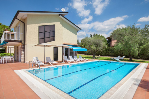 Modernes Ferienhaus für 8 Personen mit Privat-Pool in ruhiger Lage auf eingezäuntem Garten-Grundstück in Bardolino, nur 1 km vom Gardasee. Gute Einrichtung und Ausstattung, SAT-TV, Internet, Klima-Anlage. Terrasse, kinderfreundlich, Hund erlaubt.