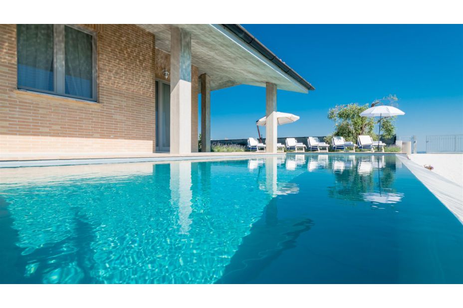 Der Pool, in einer Panoramalage, grenzt an das Haus auf der Ebene der Schlafzimmer. Die Besonderheit, die ihn auszeichnet, ist in seiner L-förmigen Form (Wasserfläche ca. 50 Quadratmetern) mit einer Mindesttiefe von 1,10 m und einem Maximum von 1,60 m.