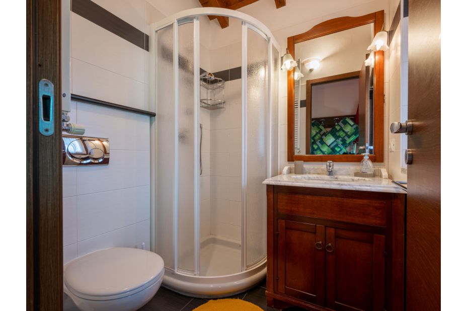 Unteres Geschoss: 1 Doppelzimmer. Ausgang zum Garten. 1 Zimmer mit 2 Betten. Bad/Bidet/WC. G-Heizung.