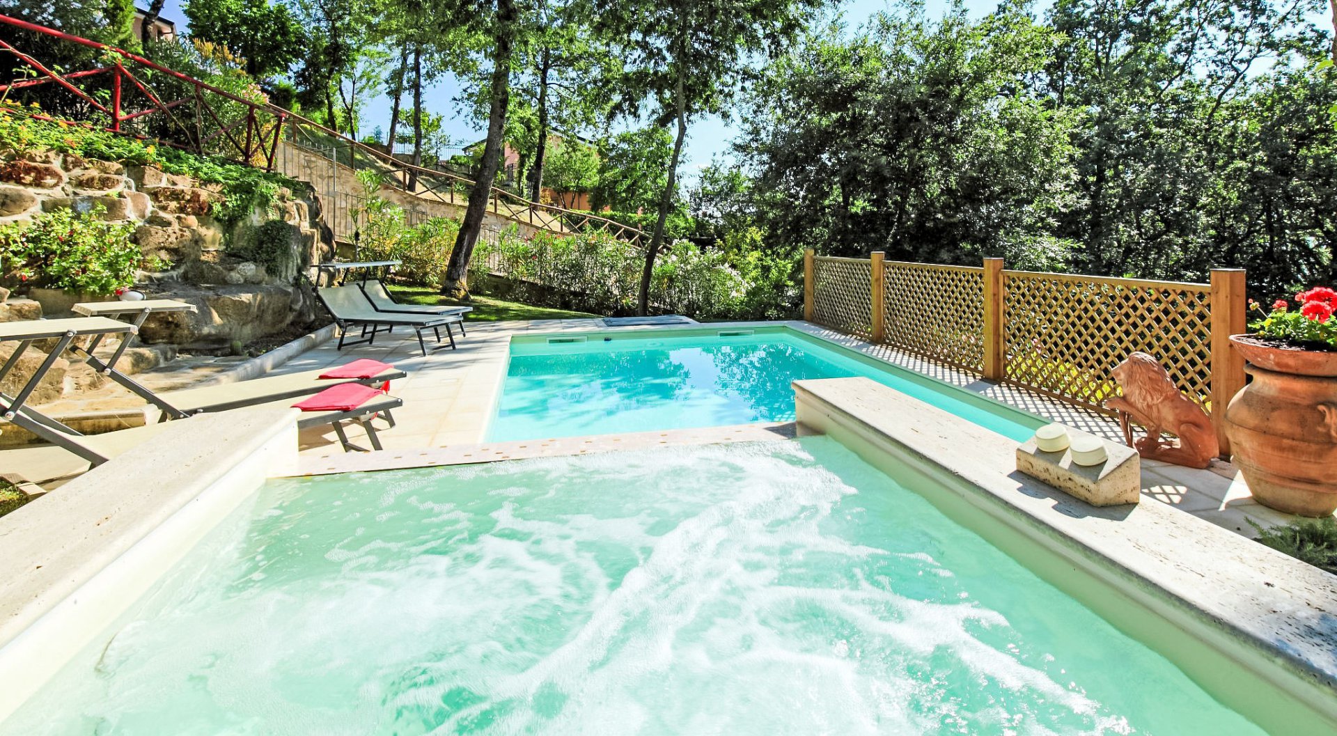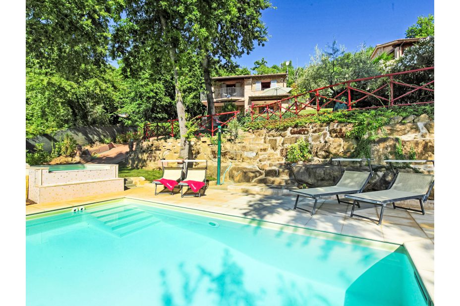 Auf einer Terrassen-Ebene unterhalb des Hauses liegt der private Swimmingpool mit Liegen, Sonnendeck, Außendusche und einem kleinen Whirlpool an das Schwimmbecken angedockt.