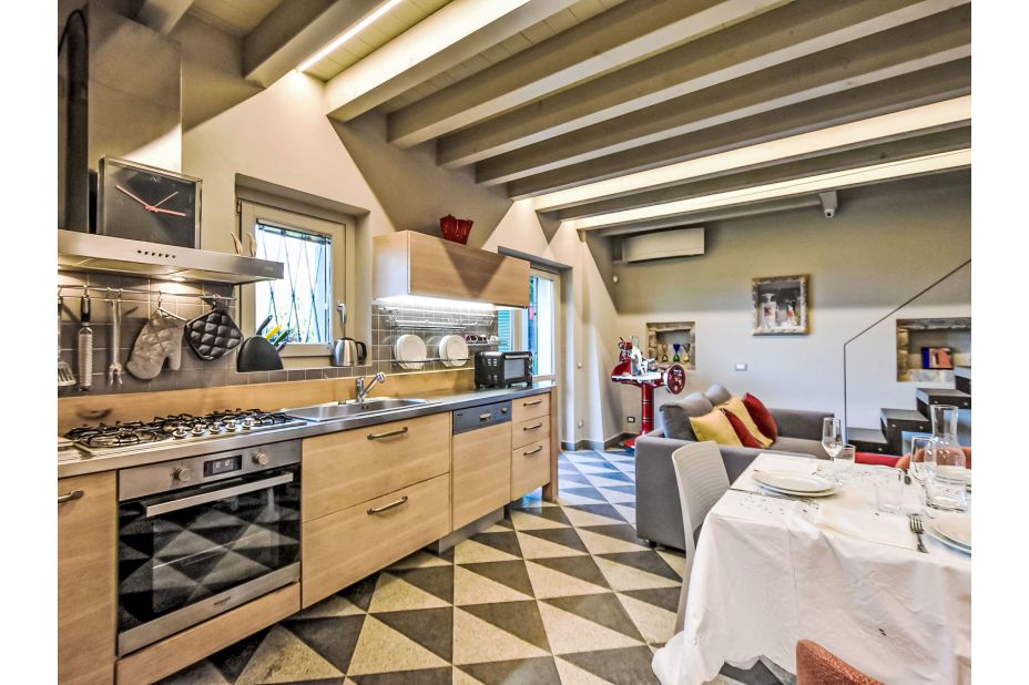 Kochnische (5 Kochplatten, Mini-Backofen, Backofen, Geschirrspüler, Toaster, Wasserkocher, elektrische Kaffeemaschine, Kapseln für die Kaffeemaschine (Nespresso) gratis). Dusche/WC.
