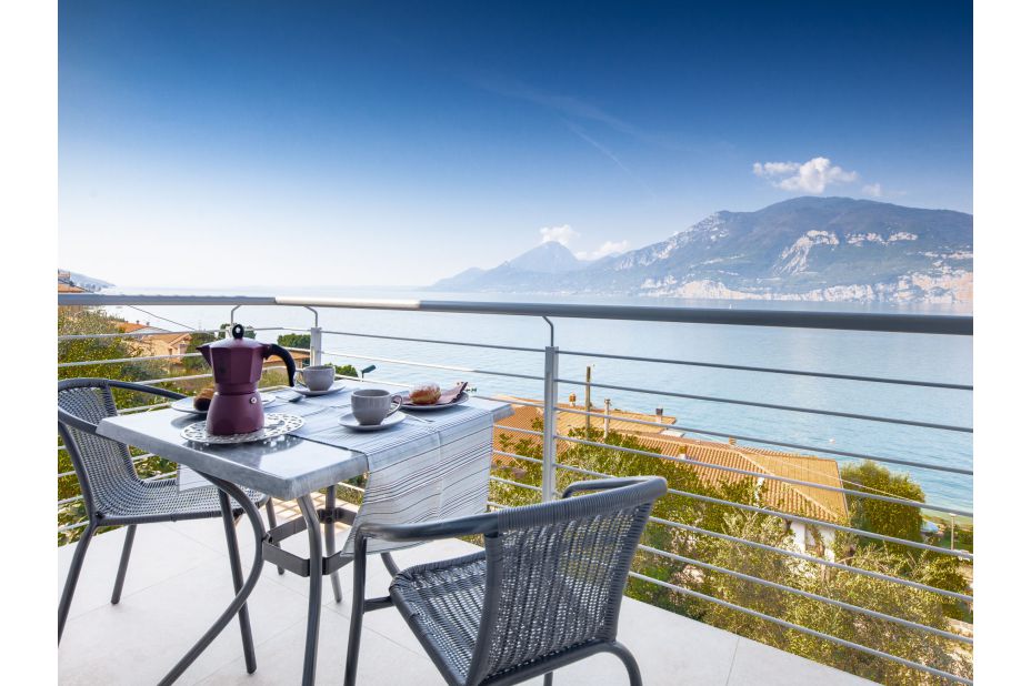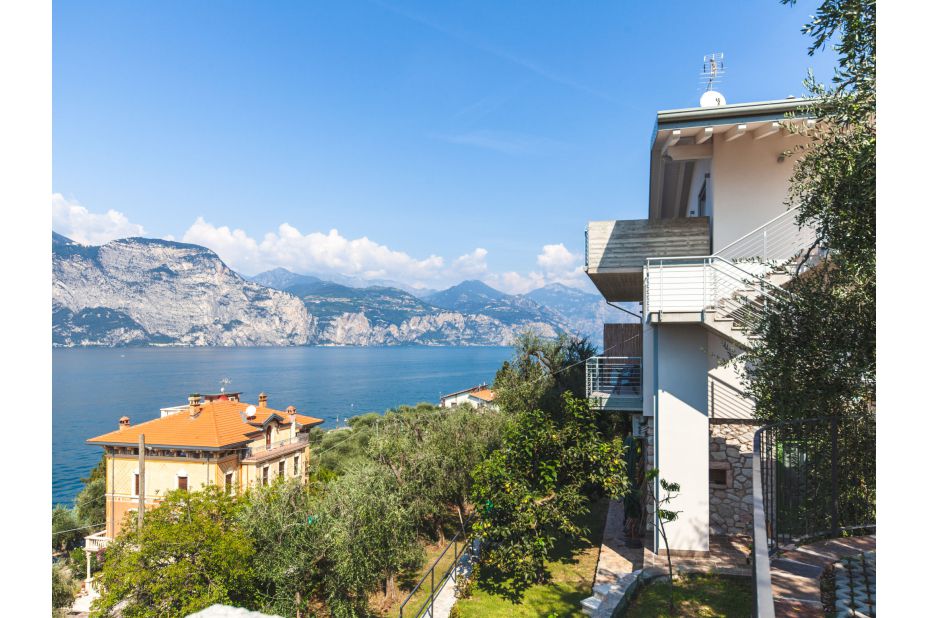 LA MAISON BLANCHE-Ora ist eines von zwei modernen Ferien-Appartement in einem renovierten Drei-Familien-Haus oberhalb von Brenzone, 400 m vom Zentrum von Brenzone, am Hang, im Villenviertel, 300 m vom See.