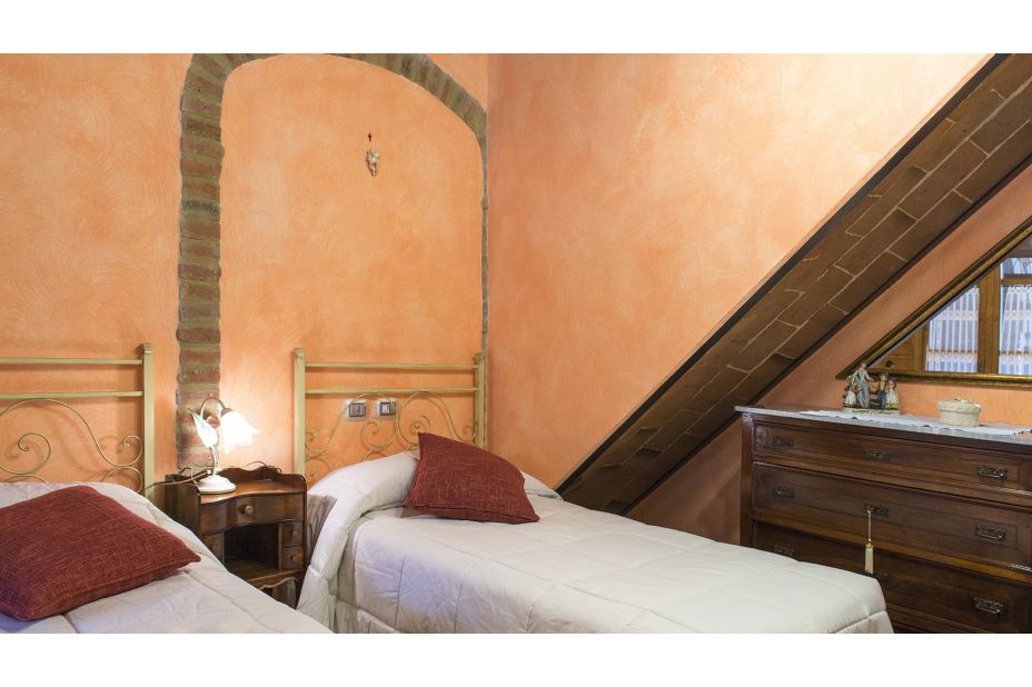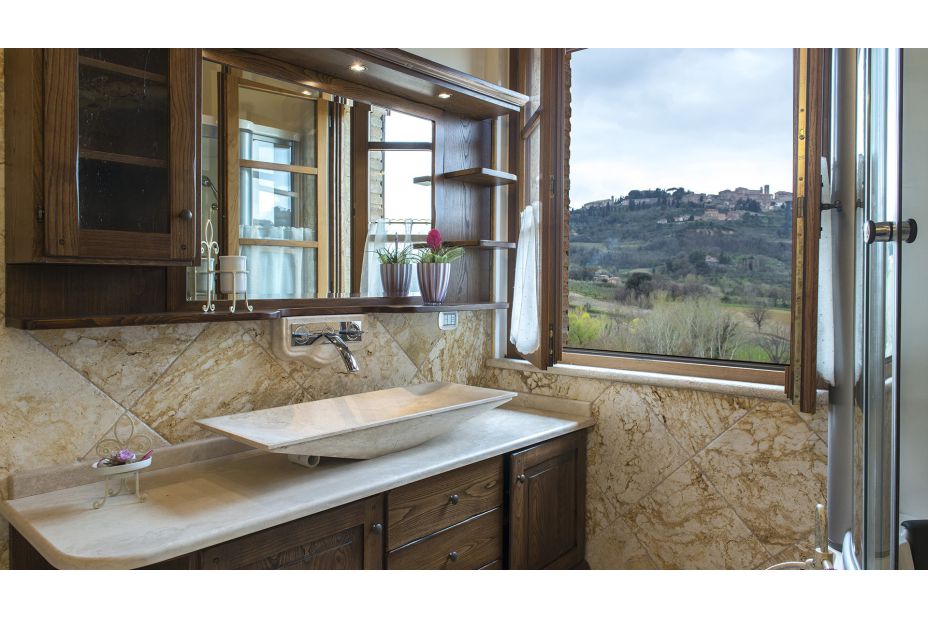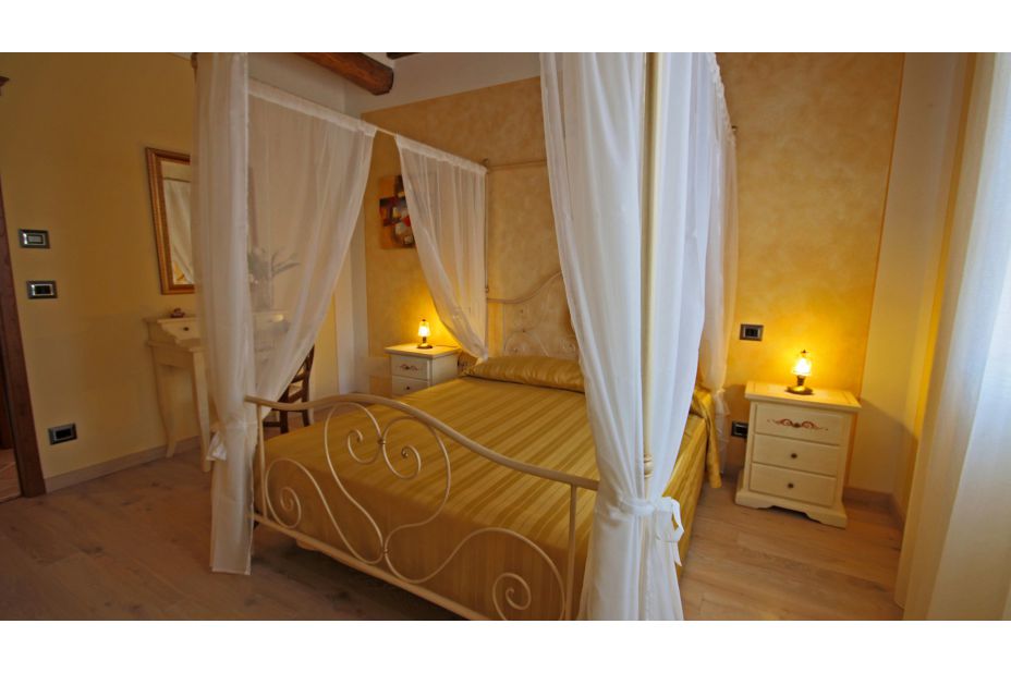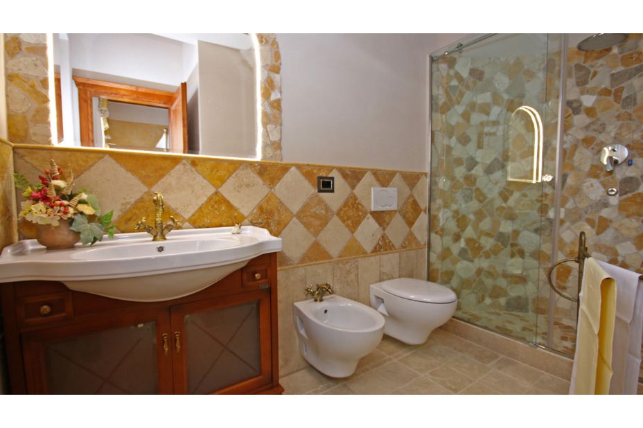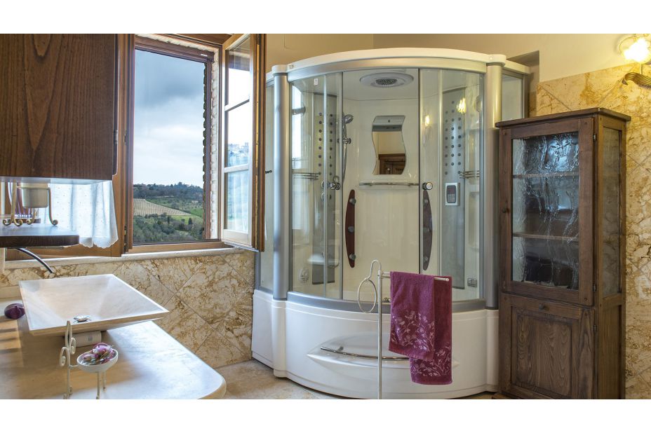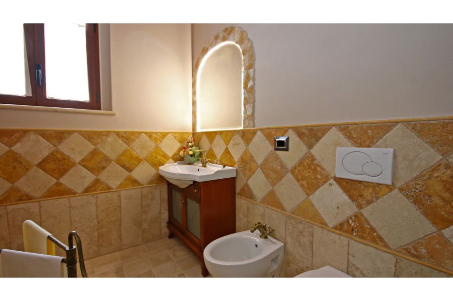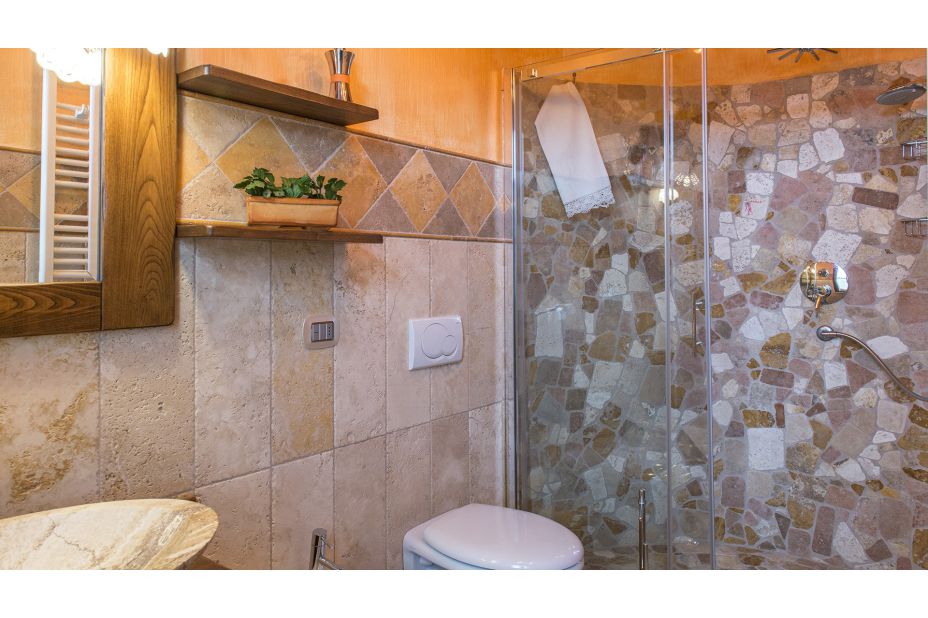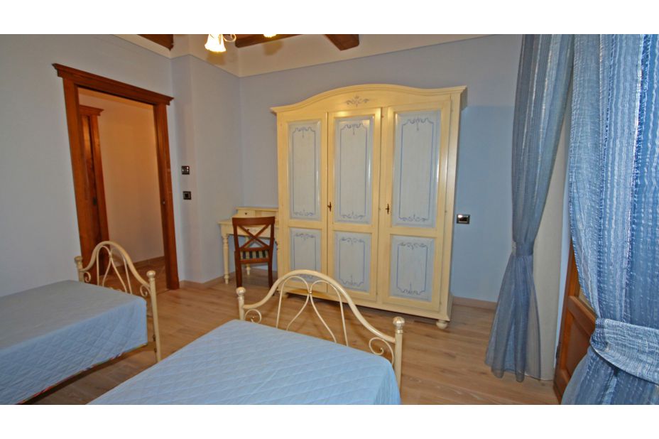 Eines der Doppelzimmer und das Zweibettzimmer verfügen über französische Fenster mit Blick auf den Portikus mit dem Sitzbereich. Eine externe Travertintreppe führt das oberste Stockwerk hinauf, das aus einem großen Wohnzimmer mit Sitz- und Essplatz, einer Küchenzeile und einer großen Panoramaterrasse mit Schiebefenstern, mit Essbereich im Freien, Grill und Holzofen besteht. Das Obergeschoss wird durch den Schlafbereich ergänzt: zwei Doppelzimmer mit jeweils eigenem Bad (eines mit Dusche und eines mit Hydromassage-Dusche und Hydromassage-Wanne) und ein Zweibettzimmer (mit zusammengefügten Betten), die von einem Badezimmer mit Hydromassage-Dusche und Farbtherapie serviert werden.