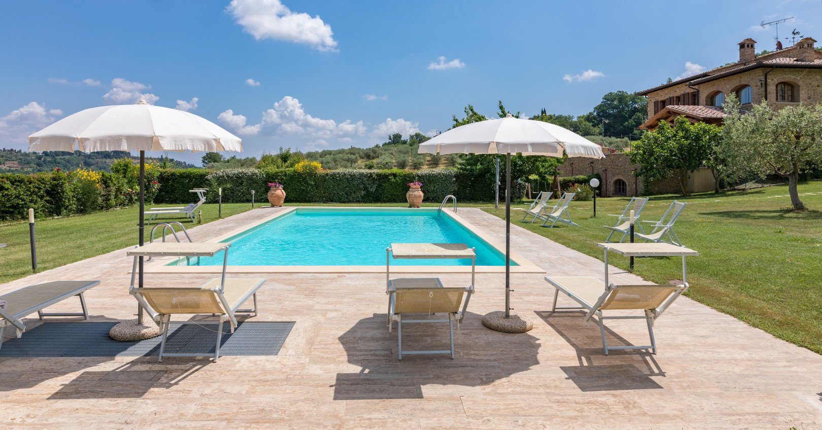 In der schönsten Ecke des Gartens, nur wenige Meter vom Haus entfernt und mit einem magischen Blick über den Borgo von Montepulciano, liegt der große und sonnige Pool, der am äußeren Rand von einer Lorbeerhecke begrenzt wird.