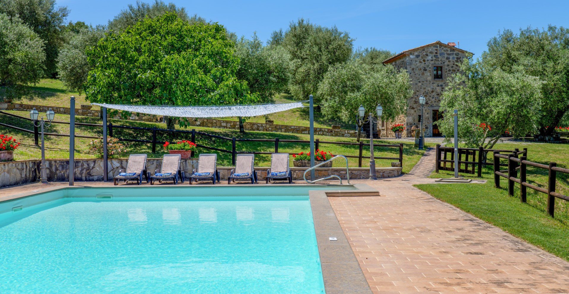 Der mit einer Kaltwasserdusche ausgestattete Poolbereich ist mit einem Pavillon mit Tisch und Stühlen, 4 Sonnenliegen und einem Segel ausgestattet.
