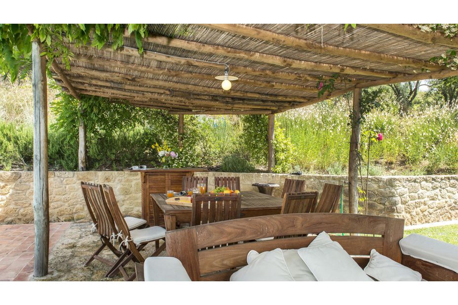 Die Umgebung umfasst Sonnenliegen, Sonnenschirme und eine schattige Lounge mit Tisch, Stühlen und einem großen Sofa unter einem Holzpavillon, der mit Glyzinien und Jasmin bedeckt ist.