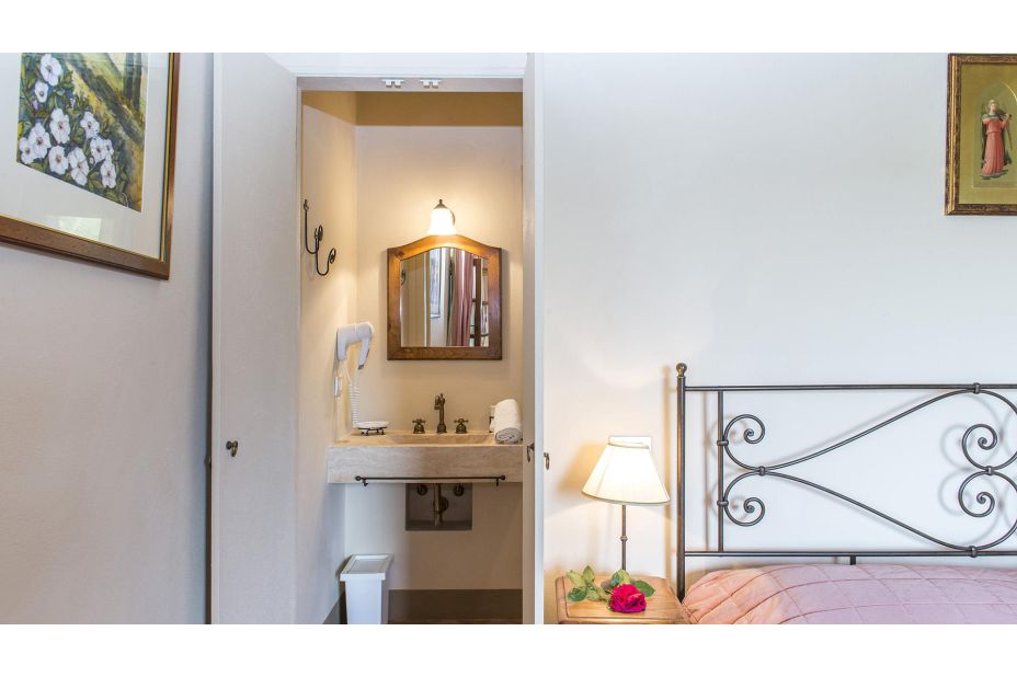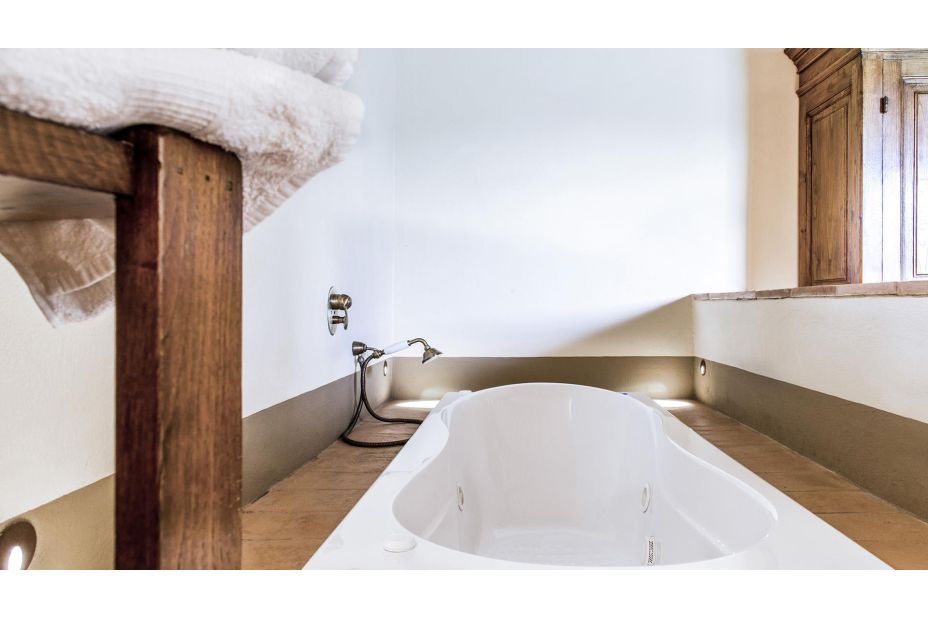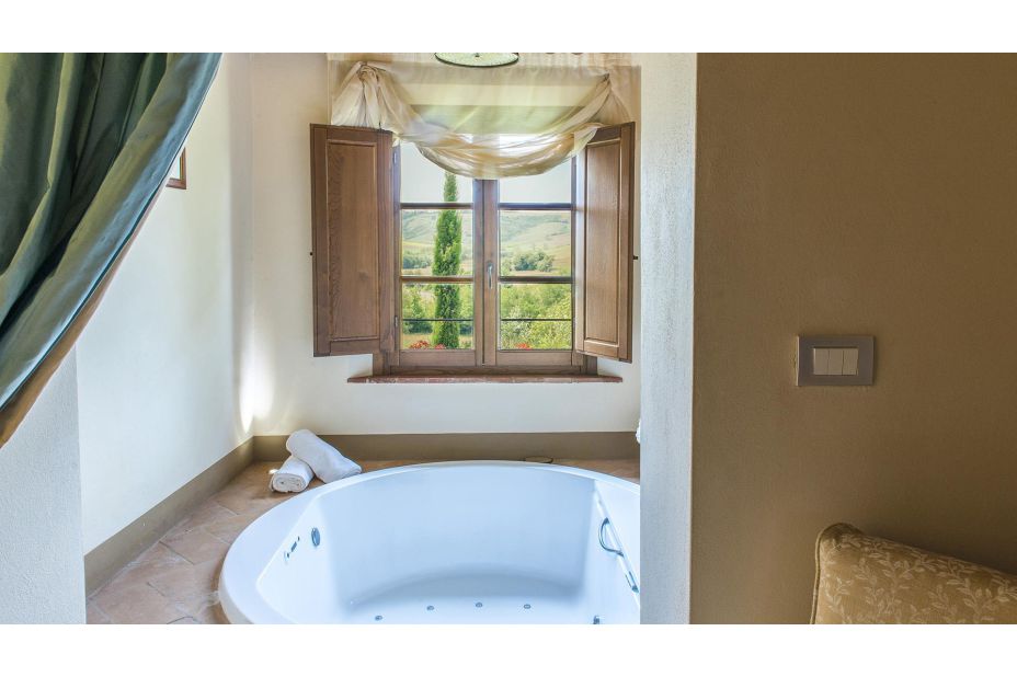 Bad mit Dusche; offenes Doppelzimmer mit französischen Fenstern und Hydromassagewanne im Zimmer.