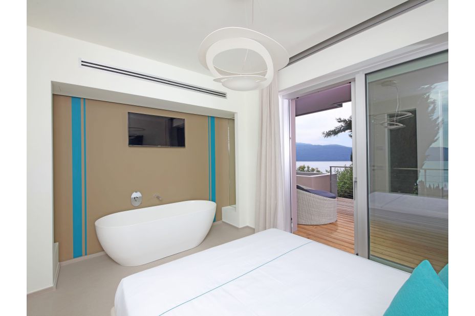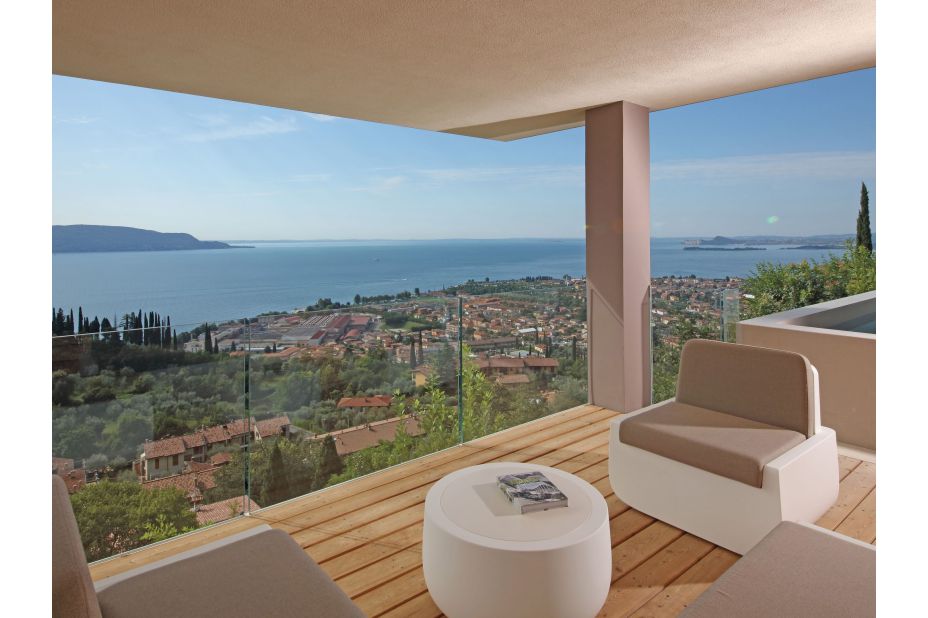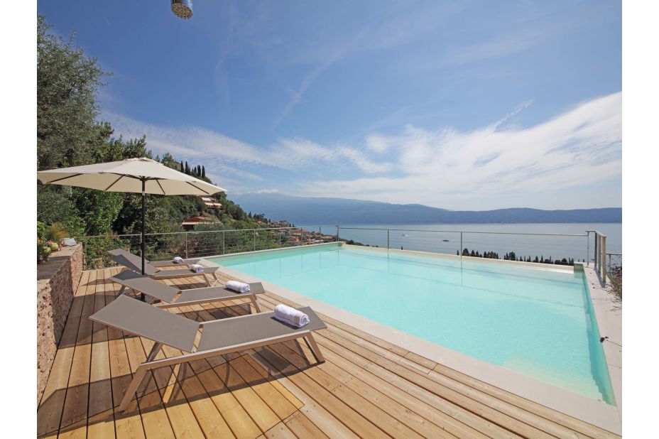 Der Panorama-Pool beefindet sich auf einerTerrasse mit unvegleichlichem Blick auf den See. Liegen und Sonnenschirme sowie