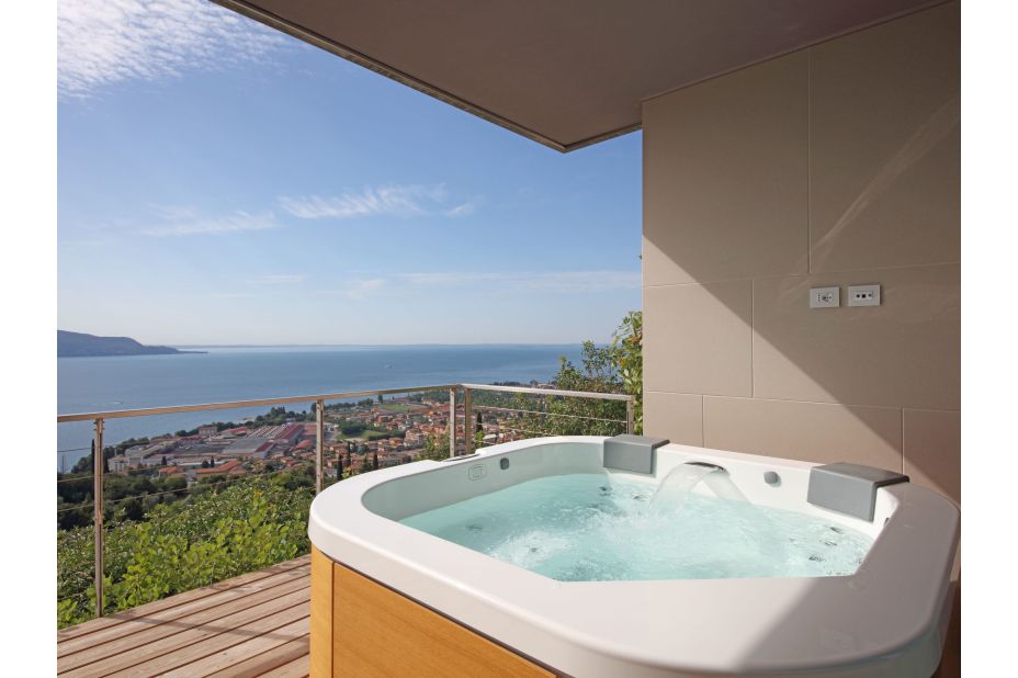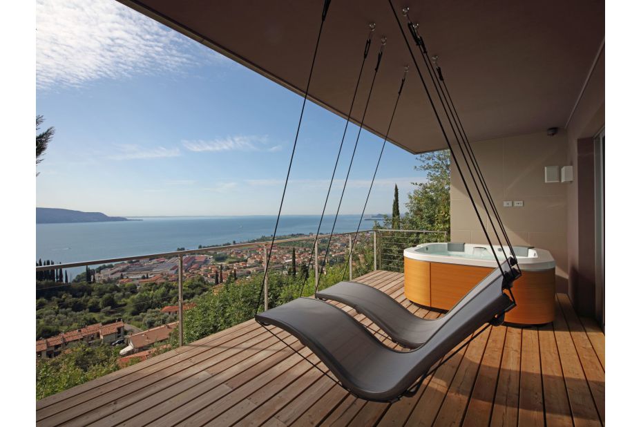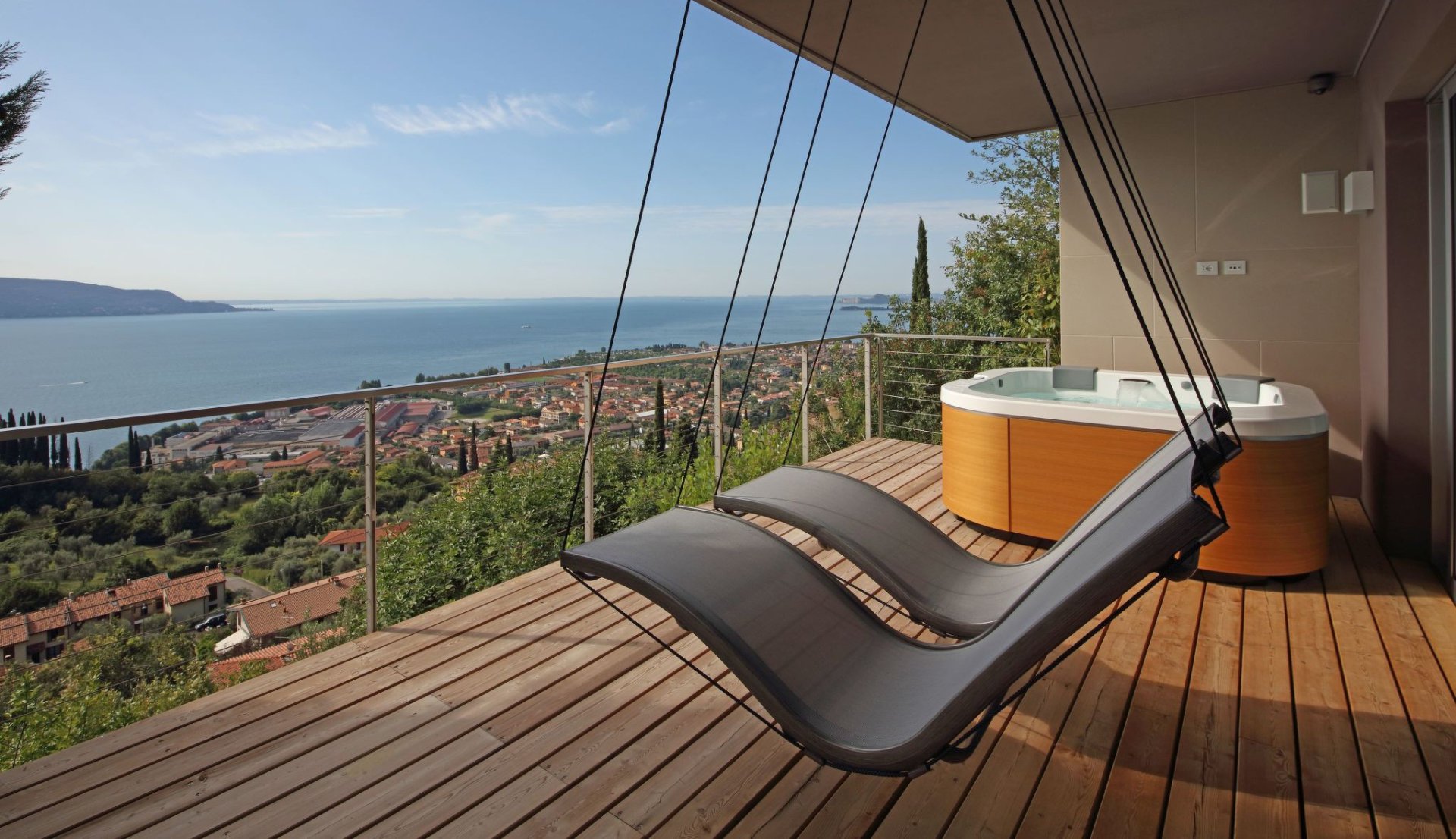Terrasse mit Relaxberich, Whirlpool und Hängeliegen.