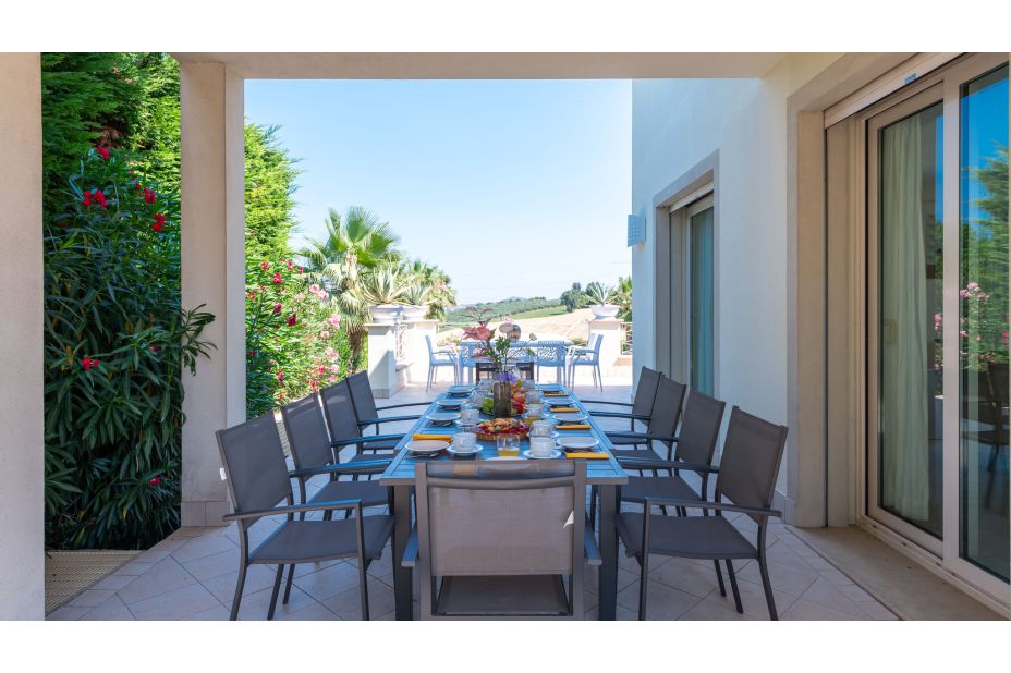 Eine große Panoramaterrasse umgibt das Erdgeschoss, mit Blick auf das Meer und den Pool; Essbereich; Holzsolarium mit Sesseln; beheizter Whirlpool (33 ° C) für vier Personen.