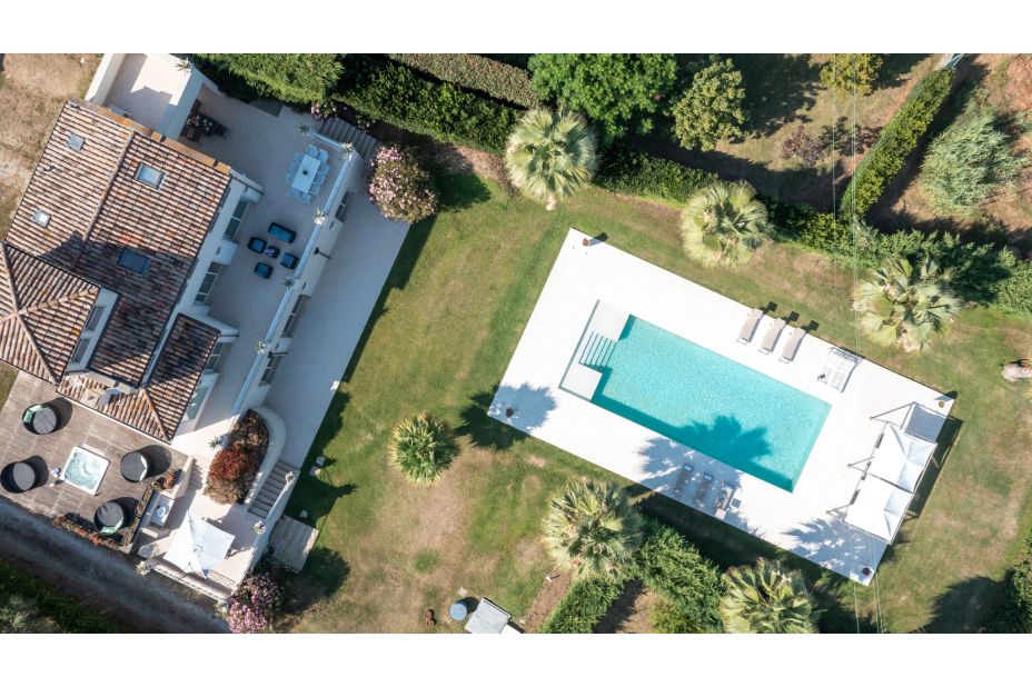 Der Pool befindet sich auf der Rückseite der Villa, erreichbar über zwei Treppen von der Panoramaterrasse.