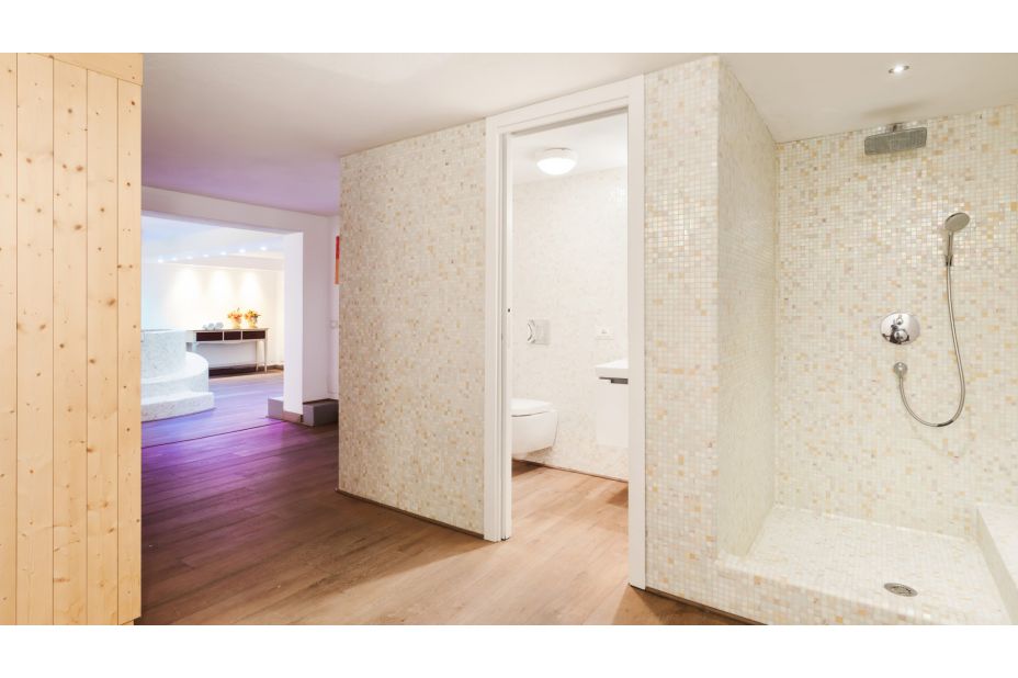 Beim Pool gibt es ein Sonnen-Deck mit Liegen und Sonnenschirmen sowie eine Warmwasser-Außendusche.
