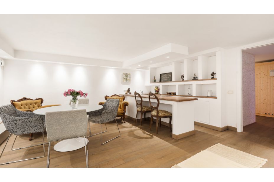 Obergeschoss: Studo; Doppelzimmer mit Ankleideraum, eigenem Bad mit Wanne und Dusche und Zugang zur Terrasse; Einzelzimmer mit Kingsize-Bett, ebenfalls mit Zugang zur Terrasse, verbunden mit dem Arbeitszimmer und Doppelzimmer. Untergeschoss: Sitzbereich; Wellnessbereich mit finnischer Sauna, Reaktionswanne, Farbtherapie, Laufband, Dusche und Gästebad; Waschküche mit Zugang zum Garten über eine Außentreppe.