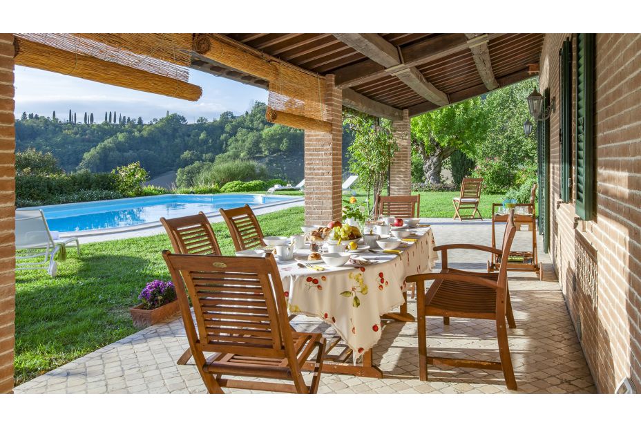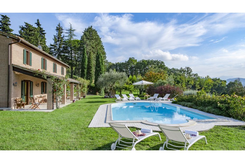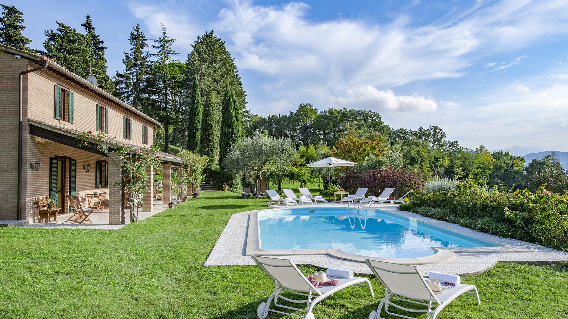 Vor dem Haus ein großer Porticato und ein herrlicher Pool mit grandiosem Ausblick.
