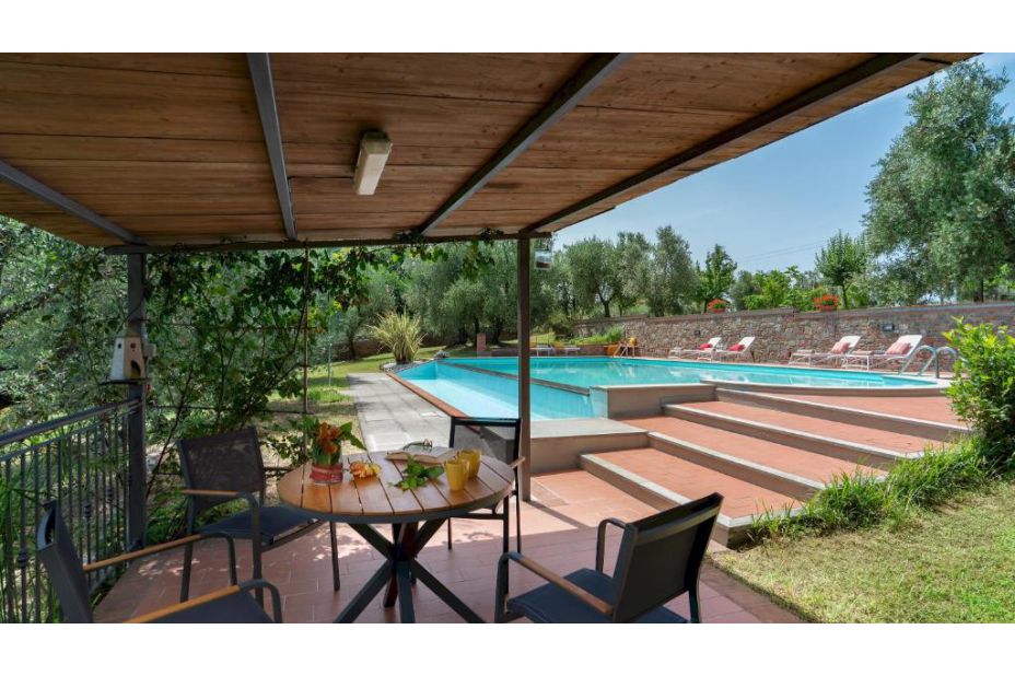 Der Pool befindet sich etwa 40 Meter von der Villa entfernt, erreichbar über zwei kurze Treppen. Rechteckig in Form, es misst 12 x 6 m mit einer Tiefe von 1,20 bis 2,20 m; es ist mit hellblauem PVC bedeckt und mit Hydromassage-Bereich und römischer Treppe für den Zugang ausgestattet.
