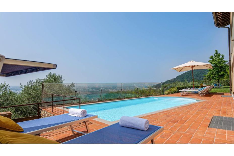 Der Pool befindet sich auf der gleichen Ebene wie das Erdgeschoss der Villa, ca. 2 m entfernt und bietet einen Panoramablick auf die Stadt Viareggio mit seinem blauen Meer.