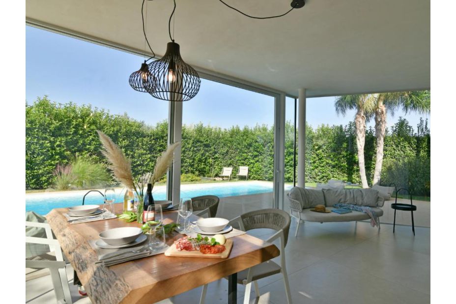 Große Fenster öffnen sich zu den Innen- und Außenmöbeln.
