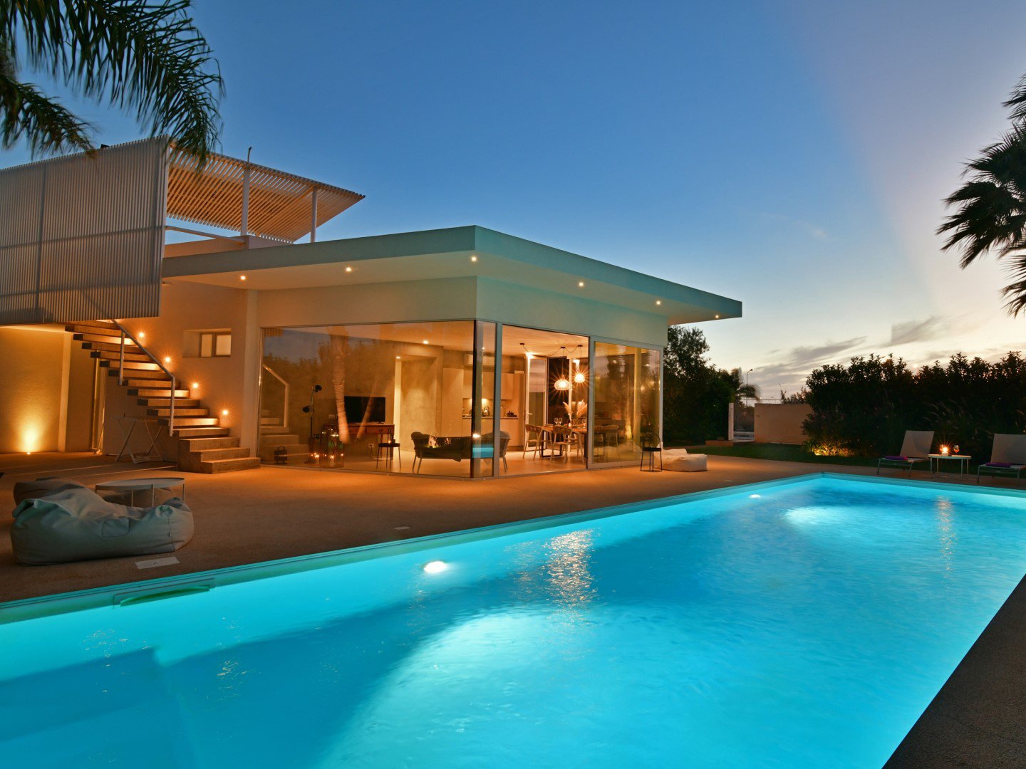 Privat-Pool, Whirlpool auf Dachterrasse, überdachte Außenbereiche, komfortable Einrichtung.