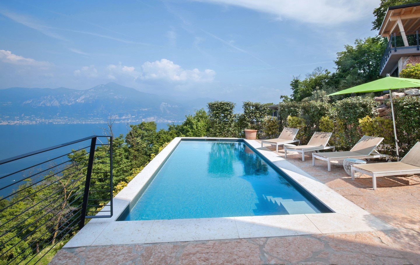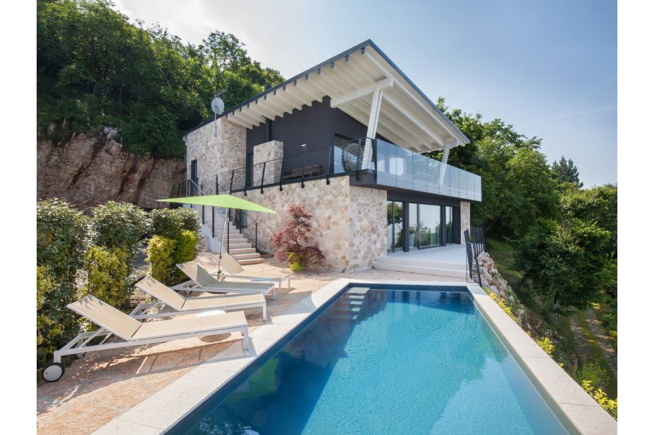 Der private Pool, integriert in die Terrasse, bietet einen weiten Blick auf den See und ist mit Liegestühlen für maximalen Komfort ausgestattet. Der Pool hat eine rechteckige Form mit den Abmessungen 3 x 8 m und eine konstante Tiefe von 1,40 m.