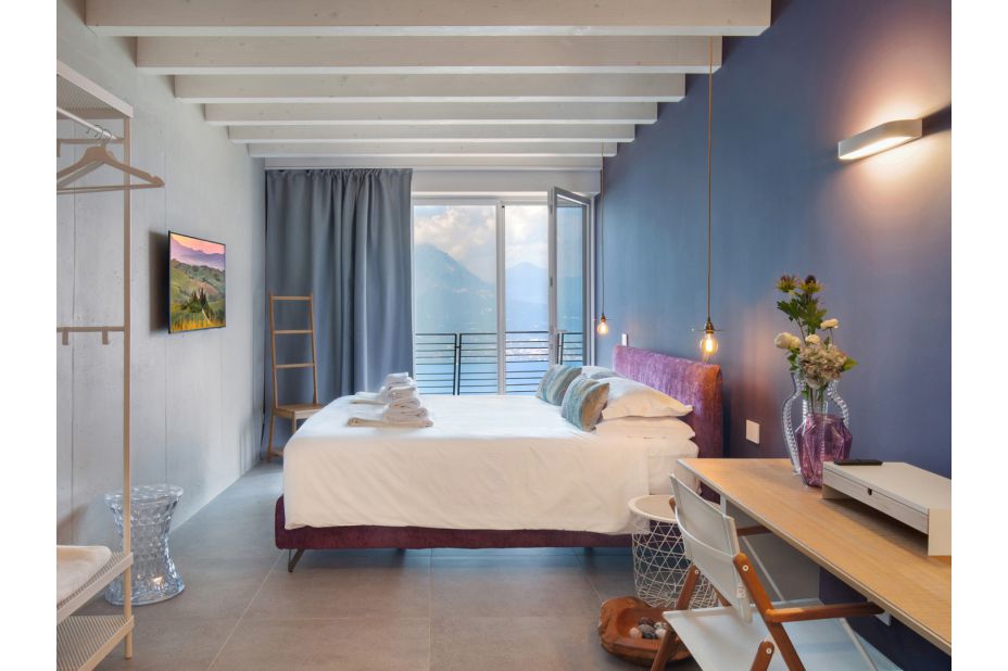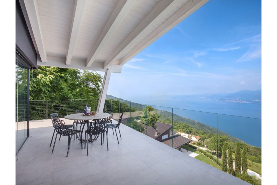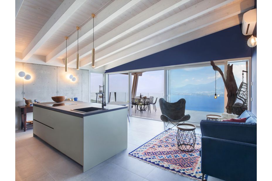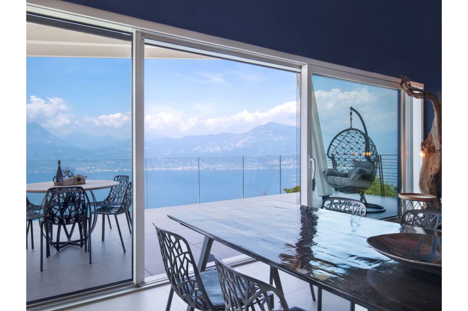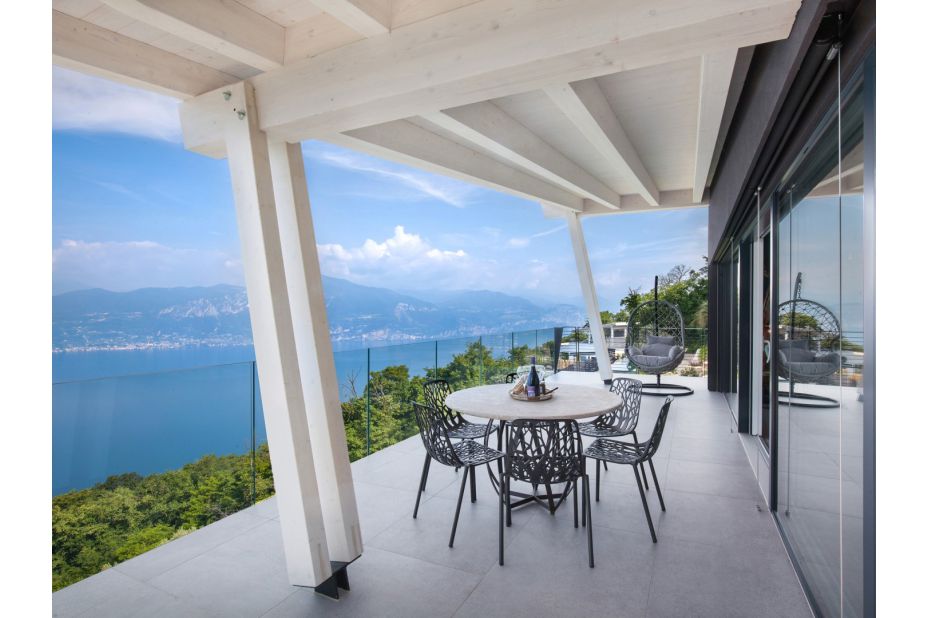 Die Villa befindet sich auf zwei Etagen und bietet einen atemberaubenden Blick auf den See und die Berge.