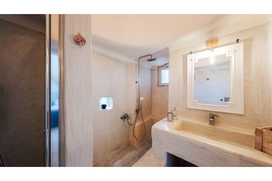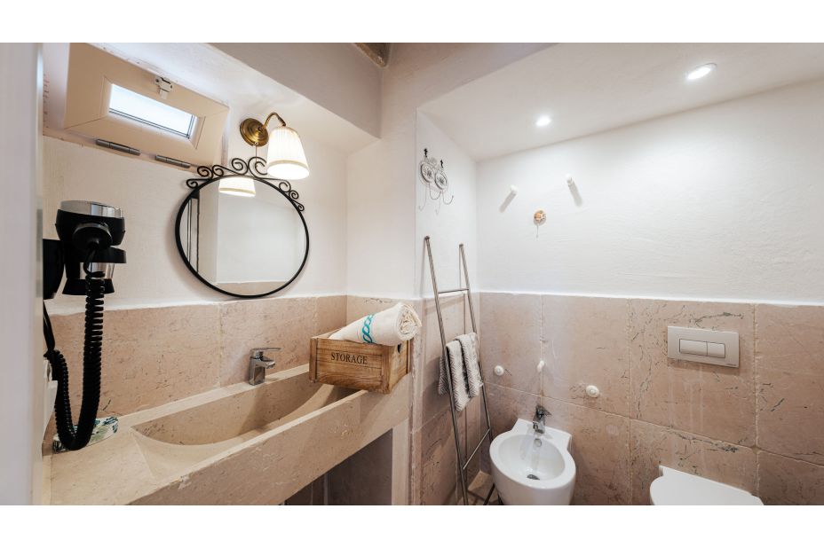 Ein Korridor führt zum Schlafbereich. Das Trullo-Zimmer ist ein Doppelzimmer mit eigenem Bad mit Steinbadewanne und Dusche. Die anderen beiden Schlafzimmer sind ein Doppelzimmer mit eigenem Bad mit Dusche und ein Doppelzimmer mit Einzelbetten immer mit eigenem Bad mit Dusche.