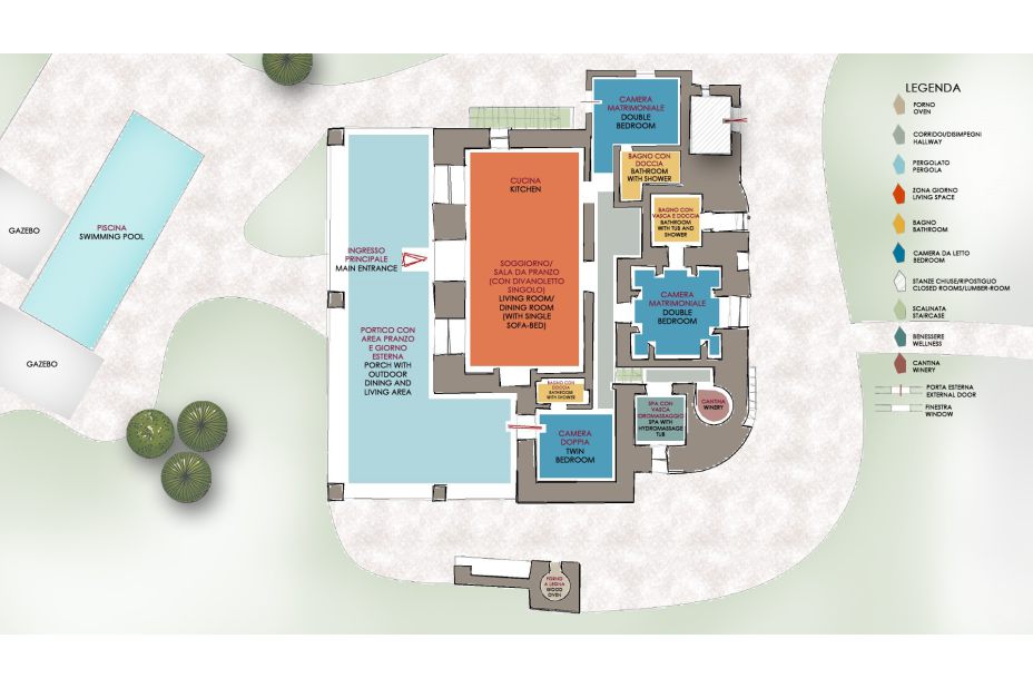 Das Anwesen, das sich auf einer Ebene befindet, verfügt über sechs Betten und in drei Schlafzimmer, alle mit eigenem Bad (zusätzlich zu einem Einzelschlafsofa im Wohnzimmer). Die Innenräume zeichnen sich durch Steinfassgewölbe aus: große überdachte Veranda, Wohnzimmer mit voll ausgestatteter offener Küche.
