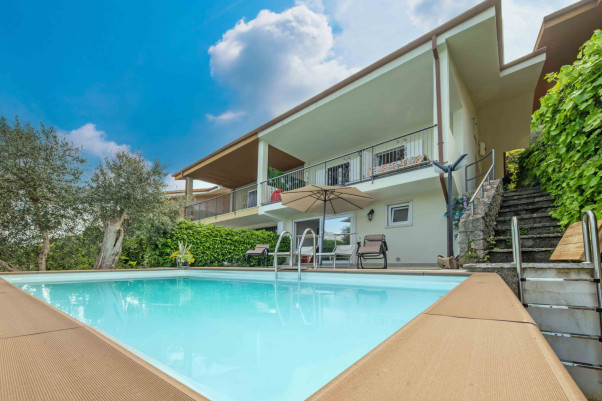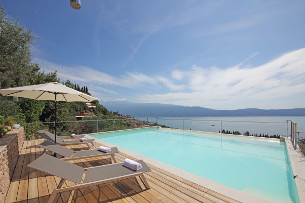 Eck-Terrassenvilla für 7 Personen mit privatem Pool und herrlichem Blick auf den See und die Voralpen, nahe bei Torri del Benaco, nur 700 m zum See, ruhige Lage, Panorama-Terrasse, Grill, SAT-TV - Internet, Klima-Anlage, Parkplätze auf dem Grundstück.